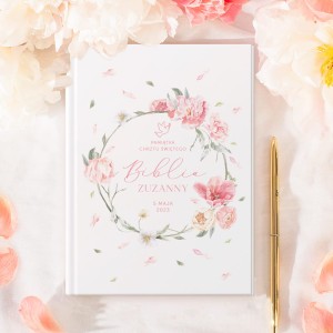 Personalizacja obejmuje dodanie imienia dziecka oraz daty uroczystości, dzięki czemu Biblia na Chrzest Święty staje się unikalną pamiątką. To prosty gest, który sprawia, że prezent nabiera indywidualnego znaczenia. Motyw gołębicy nadaje całości duchowy wymiar, a różowe rośliny wprowadzają atmosferę czułości i spokoju. Taki projekt jest idealny na prezent dla dziewczynki, łączący w sobie symbolikę i subtelność. Biblia może być wręczona przez chrzestnych, dziadków lub innych bliskich członków rodziny. Jej spokojna oprawa wizualna sprawia, że pasuje do każdego dziecięcego wnętrza. To pamiątka, która będzie towarzyszyć dziewczynce przez lata. Dzięki połączeniu duchowej symboliki i dziewczęcej estetyki Biblia ta staje się wyjątkowym upominkiem na ten szczególny dzień.