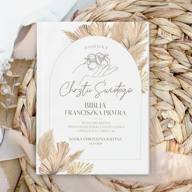 Księga jest personalizowana — na okładce znajduje się imię dziecka, data uroczystości oraz podpis osoby wręczającej, co nadaje jej indywidualny i osobisty charakter. Taki upominek staje się trwałą pamiątką, która będzie towarzyszyć maluszkowi przez całe życie, przypominając o duchowym początku. Biblia zawiera ważne fragmenty i przesłania, które mogą wspierać rozwój wiary i wartości w dorastającym dziecku. Okładka książki wykonana jest w delikatnym stylu boho, co nadaje jej lekkości i naturalnego uroku. Jasne, stonowane kolory oraz subtelne zdobienia wpisują się w modny, minimalistyczny trend, który doskonale pasuje do dziecięcego pokoju. Taka estetyka sprawia, że Biblia wygląda nie tylko elegancko, ale i przytulnie. To połączenie tradycji z nowoczesnym designem, które zachwyci zarówno rodziców, jak i gości uczestniczących w uroczystości.