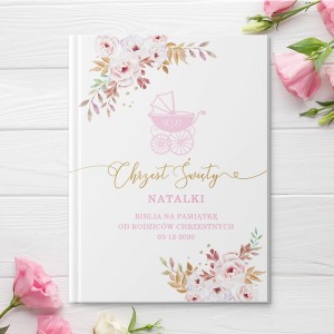 BIBLIA prezent na Chrzest Św. z imieniem Różowy Wózek