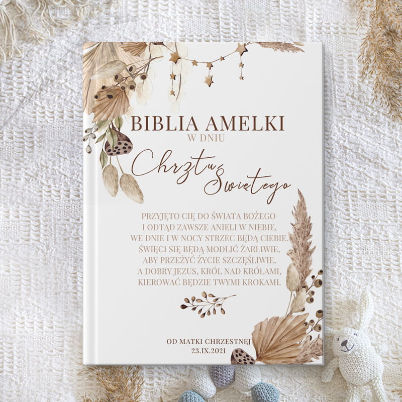 Okładka utrzymana jest w stylistyce boho, z delikatnymi roślinnymi motywami w naturalnych, stonowanych kolorach. Znajduje się na niej również subtelny napis, który podkreśla uroczysty charakter prezentu. Całość została zaprojektowana z myślą o harmonii, prostocie i symbolice. Styl boho nawiązuje do natury, spokoju i duchowej głębi, co idealnie współgra z okazją Chrztu Świętego. W centrum kompozycji znajdują się jasne elementy florystyczne – gałązki, trawy i drobne kwiaty, tworzące subtelną ramkę. Okładka jest stonowana i delikatna, dzięki czemu nie przytłacza, a raczej uspokaja i skłania do refleksji. Personalizacja obejmuje dodanie imienia dziecka, daty Chrztu oraz podpisu od osoby wręczającej prezent. Taki gest nadaje Biblii osobisty i wzruszający charakter. To wyjątkowy sposób na przekazanie bliskości, miłości i duchowego prowadzenia.