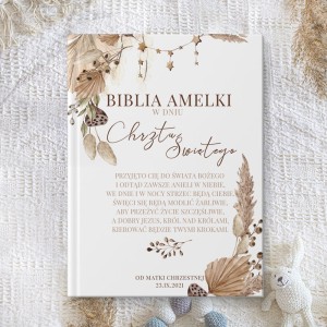 Biblia na Chrzest Święty z życzeniami w stylu boho to wyjątkowa pamiątka o duchowym charakterze.
