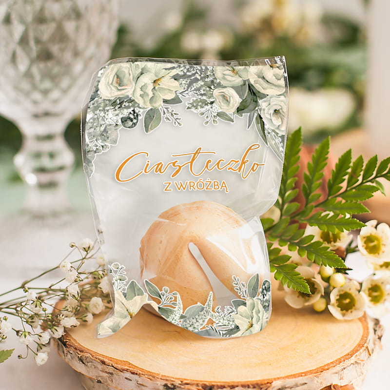 Ciasteczka z wróżbą Białe Kwiaty to zestaw 10 sztuk zapakowanych w dekoracyjne opakowania z florystycznym motywem, idealnych jako drobne podziękowanie dla gości.