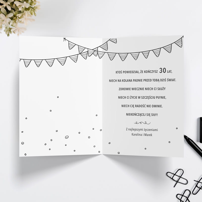 wersja z pustym wnętrzem, w której możesz samodzielnie wpisać własne życzenia, rysunek albo coś zupełnie nietypowego, co uczyni kartkę jeszcze bardziej osobistą.