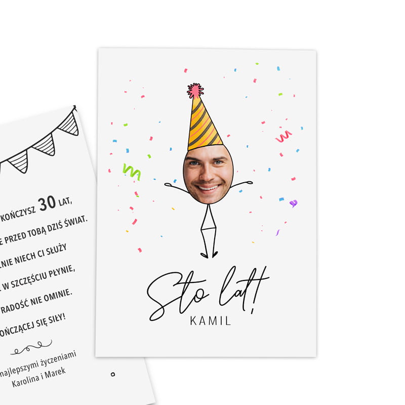 Kartka urodzinowa ze zdjęciem twarzy to oryginalny i pełen humoru prezent, który z pewnością wyróżni się wśród tradycyjnych kartek. Na okładce znajduje się grafika w stylu zabawnej ilustracji z czapeczką urodzinową i kolorowym konfetti, w którą wkomponowane zostaje przesłane przez Ciebie zdjęcie – dzięki temu kartka nabiera indywidualnego charakteru i staje się absolutnie wyjątkowa. To świetny sposób, by podkreślić osobisty charakter prezentu i sprawić solenizantowi jeszcze większą radość.