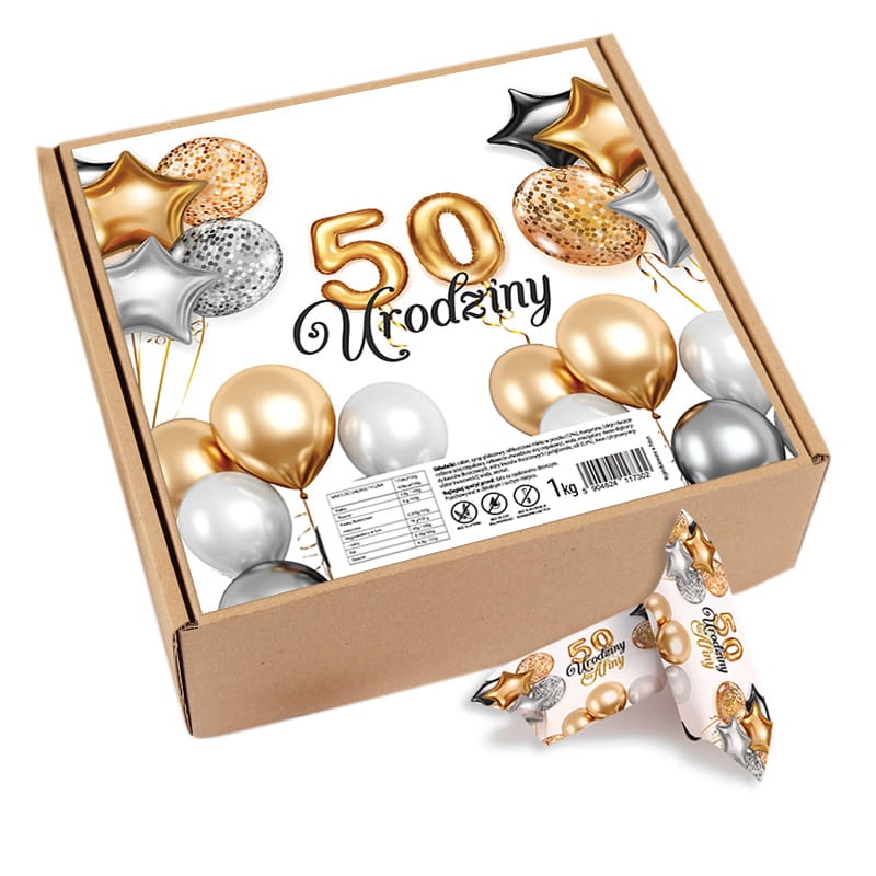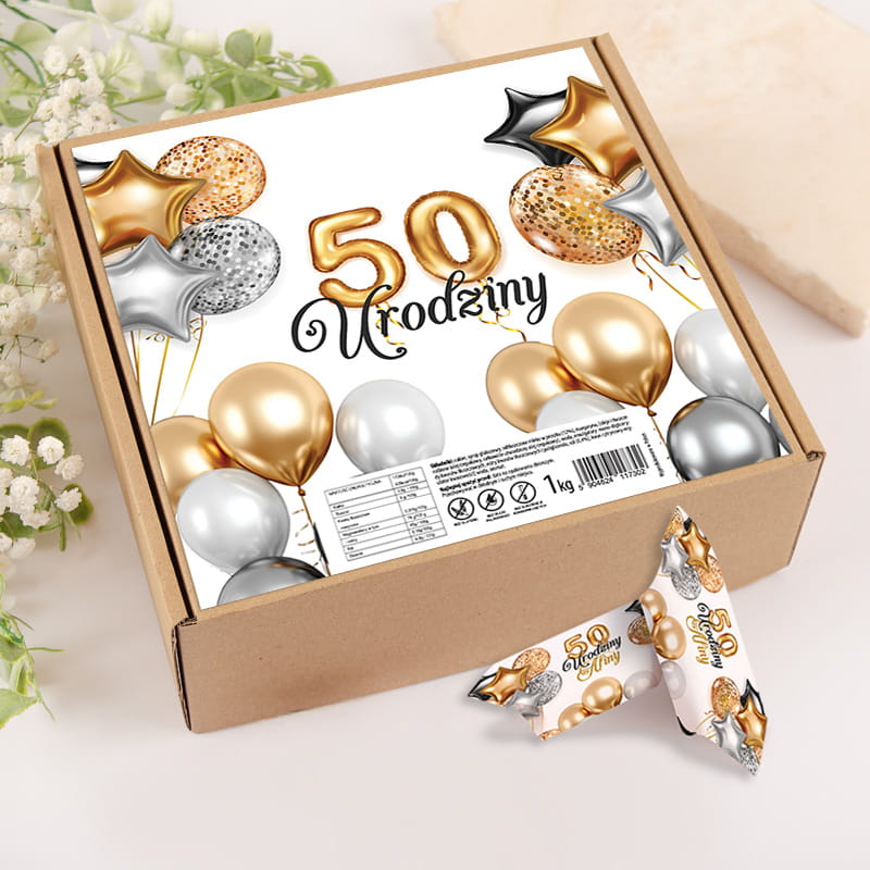 W zestawie znajdziesz 1 kilogram krówek w papierkach z wyjątkową grafiką: złote i srebrne balony, brokatowe gwiazdki oraz napis „50 urodziny”. Całość umieszczona jest w kartonowym pudełku. Krówki są polskie i wytwarzana z najwyższej jakości składników dzięki czemu są pyszne.