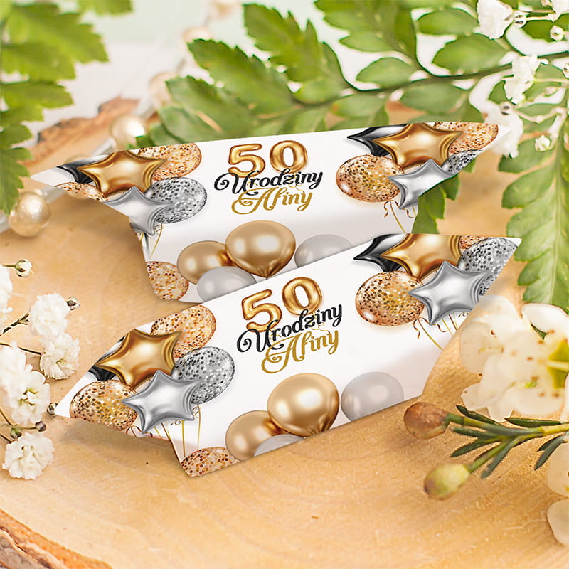 Personalizowane krówki na 50. urodziny to słodki i efektowny dodatek do świętowania wyjątkowego jubileuszu. Eleganckie opakowanie w złoto-srebrnej kolorystyce i personalizacja imieniem sprawiają, że to idealny poczęstunek dla gości.