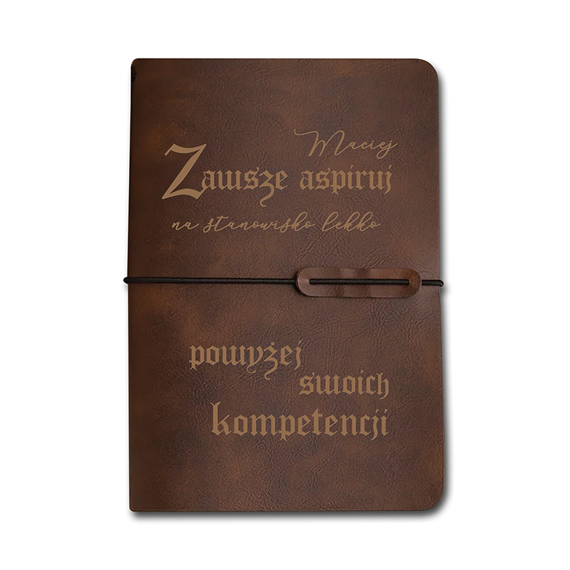 Notatnik z zabawnym cytatem „Zawsze aspiruj na stanowisko lekko powyżej swoich kompetencji” to gadżet, który od razu wywołuje uśmiech. Elegancka brązowa oprawa w połączeniu z personalizowanym imieniem sprawia, że każdy egzemplarz nabiera wyjątkowego charakteru. To praktyczny prezent, który łączy codzienne użytkowanie z nutą humoru, dlatego świetnie sprawdzi się wśród bliskich i znajomych.
