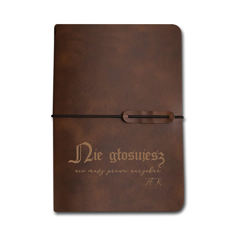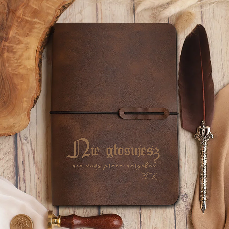 Notatnik z napisem „Nie głosujesz, nie masz prawa narzekać” to gadżet, który przyciąga uwagę i wywołuje uśmiech. Brązowa oprawa w stylu retro w połączeniu z personalizowanym inicjałem sprawia, że całość nabiera indywidualnego charakteru. To nie tylko praktyczny przedmiot, lecz także zabawny dodatek, który świetnie wpisuje się w klimat spotkań ze znajomymi.