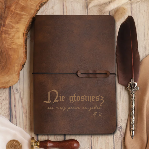 Okładka notatnika wykonana została z przyjemnej w dotyku eko-skóry w klasycznym brązowym odcieniu. Zamykana jest na elastyczną gumkę, dlatego wnętrze zawsze pozostaje dobrze zabezpieczone. W środku znajdują się kartki w kratkę, idealne zarówno do zapisków, jak i do szkiców. Co więcej, tasiemka umożliwia zaznaczenie bieżącej strony, dzięki czemu łatwo wrócić do ważnych notatek. Na froncie nadrukowany jest wyrazisty napis w stylizowanej czcionce, a pod nim personalizowany inicjał, który podkreśla indywidualny charakter upominku. Kompaktowy rozmiar sprawia, że notatnik zmieści się w torbie czy plecaku i zawsze będzie pod ręką.