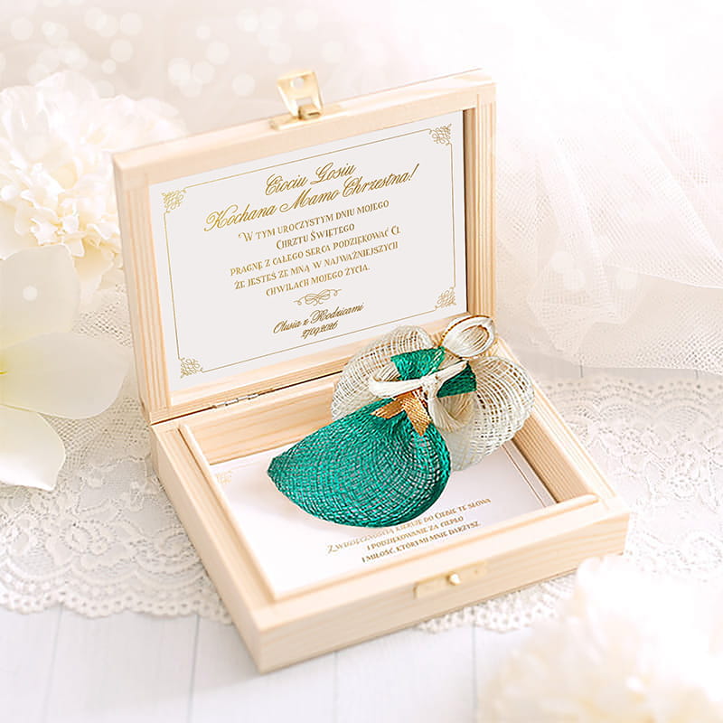 Całość zapakowana jest w drewnianą skrzyneczkę, która podkreśla naturalny i elegancki charakter upominku. W środku znajduje się aniołek, symbol opieki, duchowości i czuwania nad dzieckiem, a także wpis ze słowami wdzięczności. Zestaw ma personalizowany charakter – można na nim umieścić imię osoby, dla której jest przeznaczony, podpis dziecka lub rodziców, a także datę uroczystości, co sprawia, że staje się on indywidualnym i osobistym gestem. Taka forma podziękowania z okazji Chrztu Świętego nie tylko wyraża wdzięczność, ale też wzrusza i na długo pozostaje w pamięci. Drewniany aniołek jest nie tylko dekoracją, ale także symbolicznym akcentem religijnym, który ma głębokie znaczenie dla obdarowanego. Skrzyneczka z aniołem i cytatem to drobny, ale przemyślany upominek, który idealnie oddaje emocje związane z tym wyjątkowym dniem.