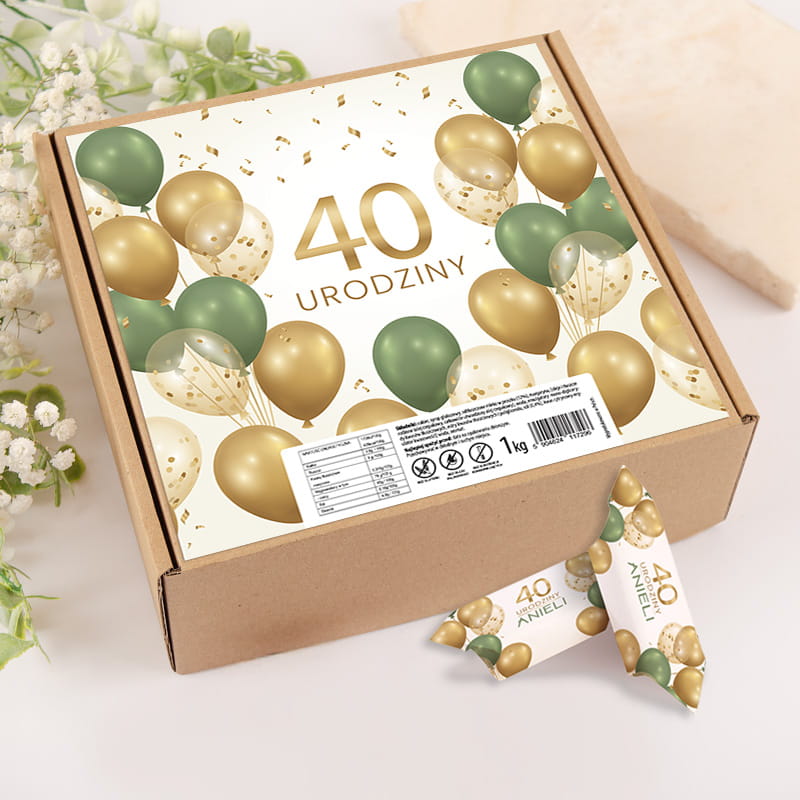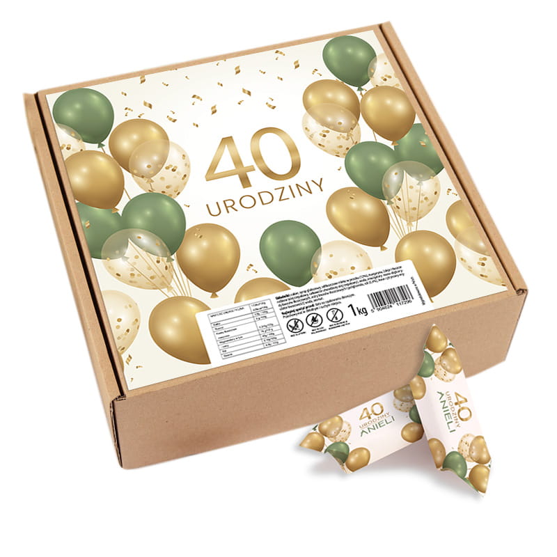 Krówki przygotowano z delikatnej, mlecznej masy o kremowej konsystencji i tradycyjnym smaku, który kojarzy się z dzieciństwem. Każdy cukierek został zapakowany w ozdobny papierek z nadrukiem przedstawiającym balony i konfetti w odcieniach złota, zieleni oraz bieli. Na środku widnieje napis z liczbą „40” oraz imieniem jubilata, dzięki czemu nawet najmniejszy szczegół przyjęcia jest dopracowany. Personalizowane krówki sprawdzą się zarówno jako słodki poczęstunek, jak i drobny prezent dla gości, który z pewnością wywoła uśmiech. Całość zapakowana jest w solidne pudełko o wadze 1 kg. Na wieczku znajduje się duży, elegancki nadruk z tą samą, spójną grafiką, co na papierkach. Złote i zielone balony dodają całości klasy, a pastelowe tło sprawia, że zestaw prezentuje się bardzo stylowo. Pudełko nie tylko ułatwia przechowywanie krówek, ale też samo w sobie może być dekoracją stołu lub częścią prezentu dla jubilata.