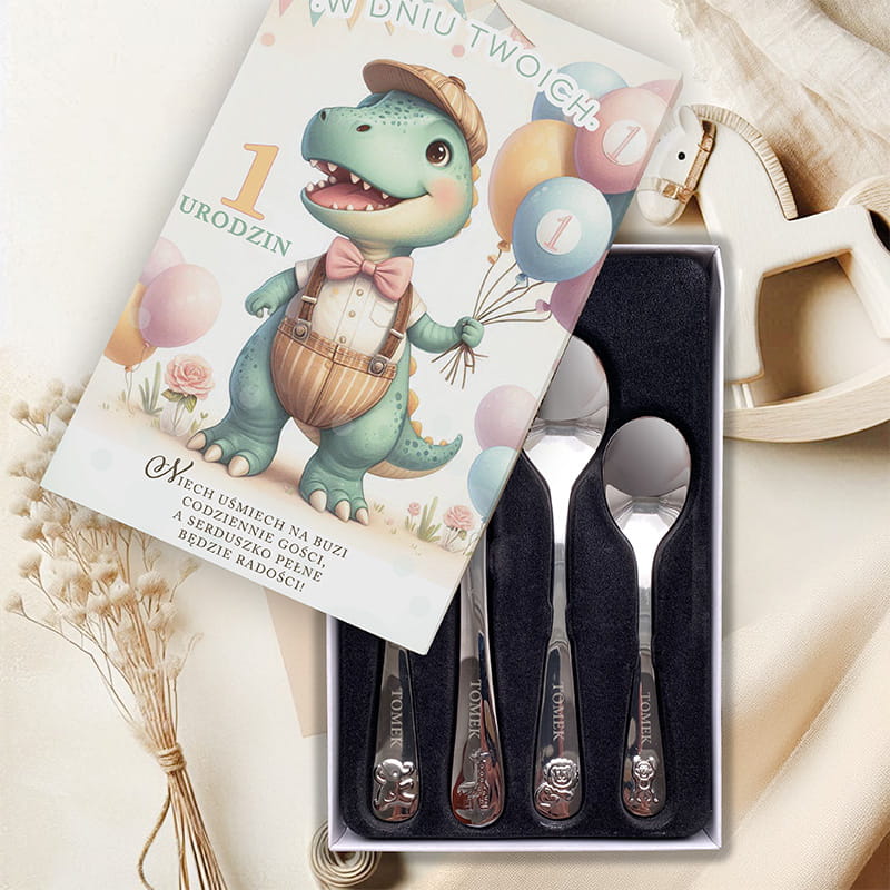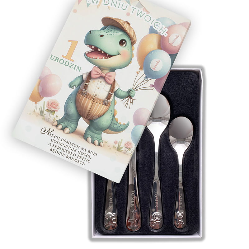 Zestaw zawiera widelec, nóż, łyżkę i małą łyżeczkę - zestaw idealny dla dziecka. Na rączkach umieszczone są subtelne grawerunki przedstawiające zwierzątka, a także imię dziecka, dzięki czemu zestaw nabiera wyjątkowego, osobistego charakteru. Całość zapakowana jest w eleganckie pudełko, którego front zdobi ilustracja sympatycznego dinozaura w pastelowych kolorach. Trzyma on balony i uśmiecha się szeroko, jakby sam chciał świętować pierwsze urodziny. Na opakowaniu znajduje się również delikatny napis: „Niech uśmiech na buzi codziennie gości, a serduszko pełne będzie radości” - tworząc ciepły, urodzinowy klimat. Dzięki ozdobnej formie, prezent jest gotowy do wręczenia bez potrzeby dodatkowego pakowania.