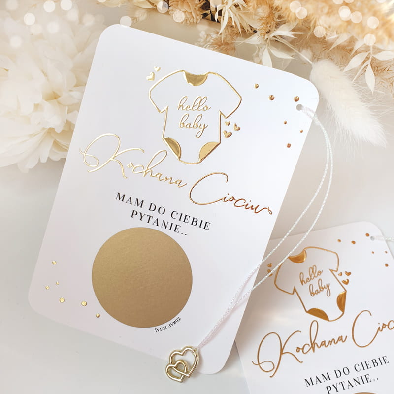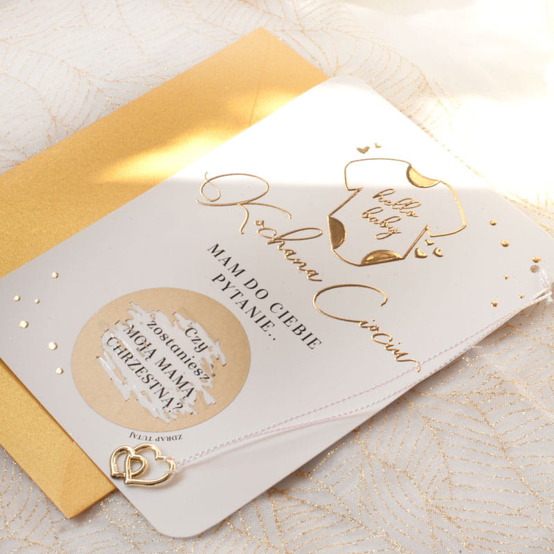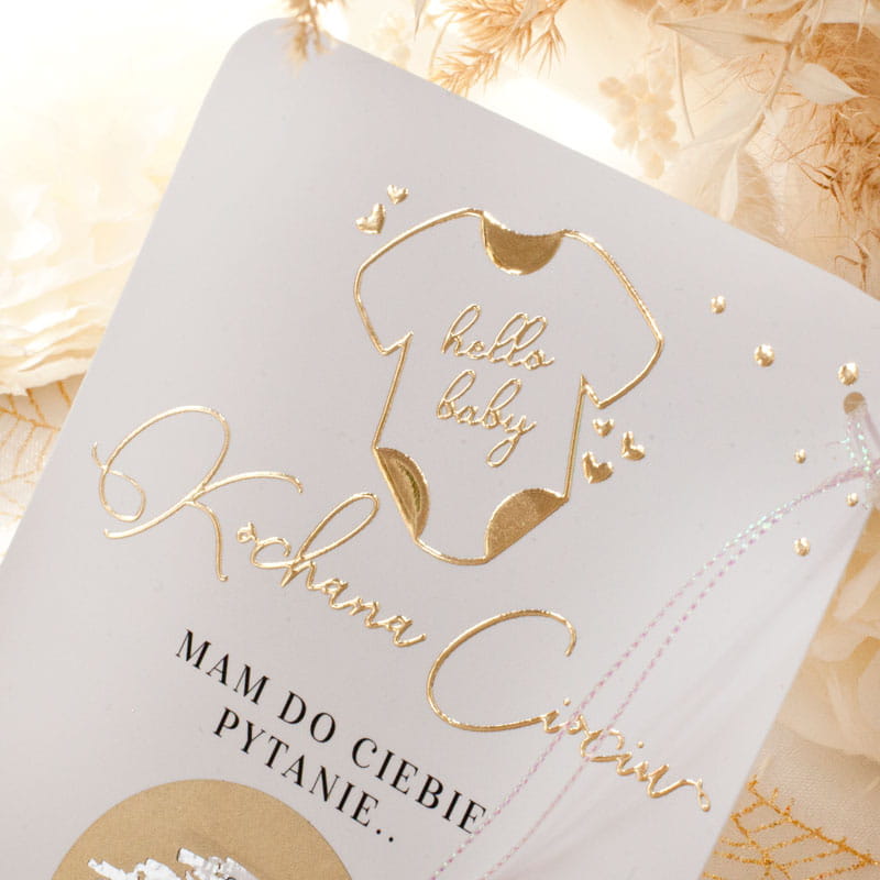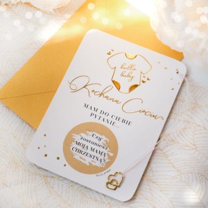 Oryginalna forma przekazu sprawia, że gest zaproszenia zostaje zapamiętany na długo. Subtelne kolory i symbolika dziecięcego body przywodzą na myśl ciepło domowego ogniska i bliskość rodziny. Pytanie pod zdrapką dla chrzestnej sprawdzi się zarówno w małym, kameralnym gronie, jak i podczas większych uroczystości. Napis „Hello Baby” od razu wywołuje uśmiech i pozytywne emocje. Złote elementy dodają całości elegancji, bez przytłaczania delikatnego przesłania. Wręczenie zdrapki z pytaniem dla chrzestnych to prosty, a zarazem niezwykle wzruszający gest. Dzięki niej prośba o bycie chrzestnym staje się wyjątkowym przeżyciem, które na zawsze pozostaje w pamięci.