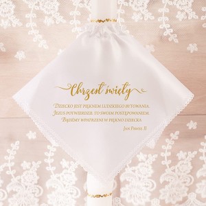 Profitka na gromnicę z okazji Chrztu Świętego to elegancka ozdoba, która nadaje świecy uroczystego charakteru. Wyróżnia ją subtelny design oraz estetyczne wykończenie, które doskonale komponują się z oprawą ceremonii. Na profitce znajduje się piękny cytat Jana Pawła II, który dodaje całości głębi duchowej. To wyjątkowy detal, który wzbogaca symbolikę i stanowi pamiątkę na długie lata.