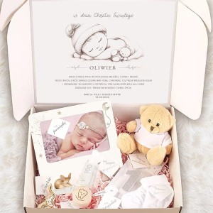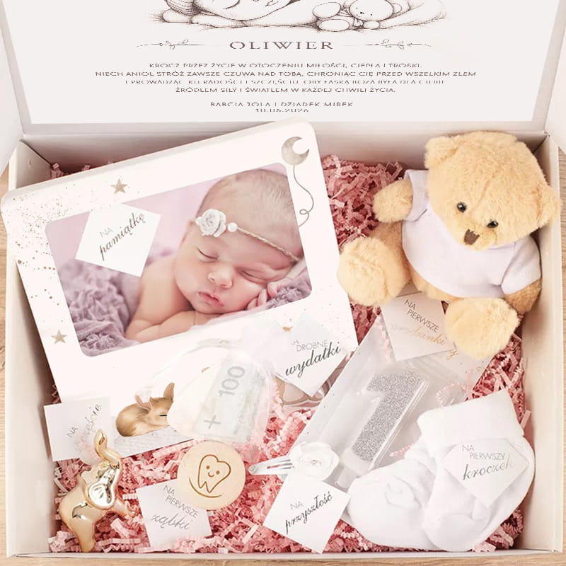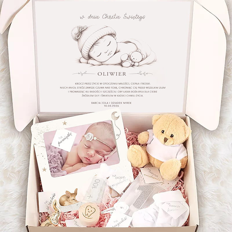Każdy element został opisany w zabawny i symboliczny sposób, co dodaje całości uroku i lekkości. Personalizowana skrzynka sprawdzi się jako pamiątka od rodziców chrzestnych, dziadków czy bliskich przyjaciół. To piękny sposób na stworzenie wspomnień, które będą towarzyszyć dziecku przez całe życie.