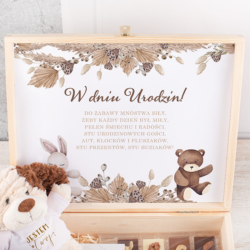 SKRZYNKA drewniana na urodziny dziecka książka sztućce pluszak