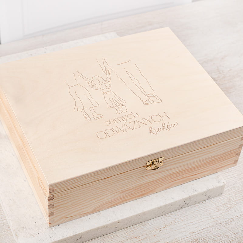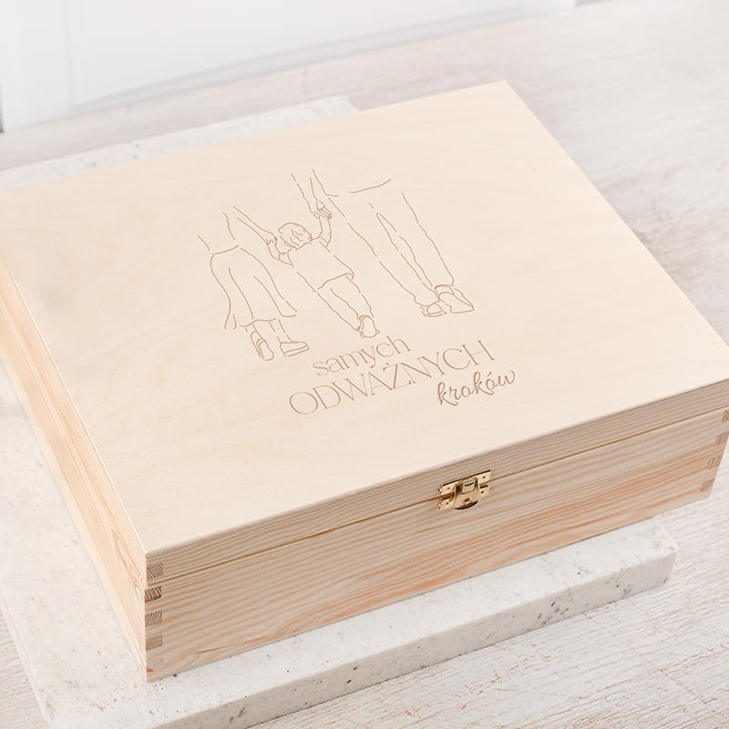 To prezent, który sprawdzi się doskonale jako upominek od dziadków, chrzestnych, rodziców chrzestnych czy bliskich przyjaciół rodziny. Drewniana skrzynka z pluszakiem, książką, czekoladą i sztućcami to uroczy i funkcjonalny prezent na urodziny dziecka.