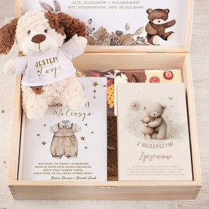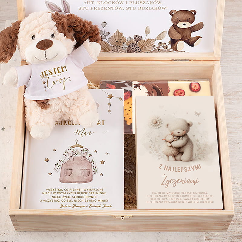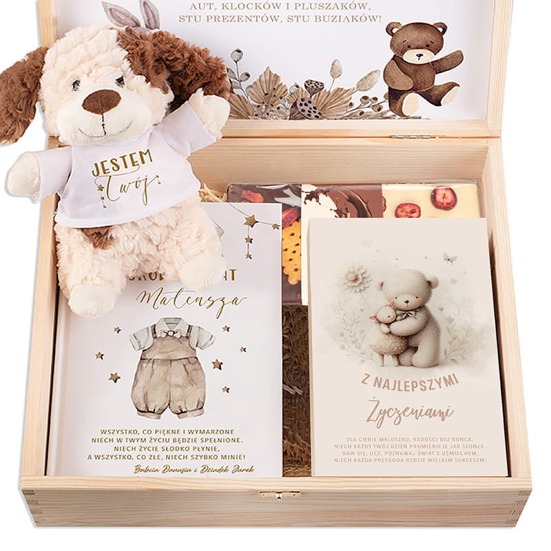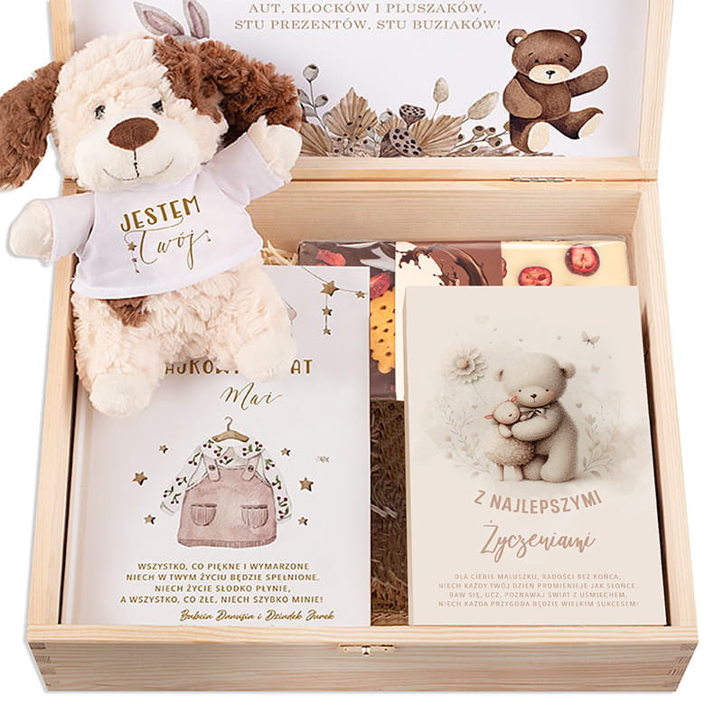 W eleganckiej skrzynce znajduje się kilka wyjątkowych elementów. Przede wszystkim mięciutki, pluszowy piesek z napisem „Jestem Twój” – uroczy towarzysz codziennych zabaw i pierwszych drzemek. Pluszak jest przyjazny w dotyku, bezpieczny dla dzieci i natychmiast zyskuje sympatię najmłodszych.W zestawie znajduje się również tabliczka czekolady z dodatkami. Książka z bajkami i dedykacją to kolejny element, który sprawia, że prezent zyskuje sentymentalną wartość – to nie tylko opowieści na dobranoc, ale również piękna pamiątka z dzieciństwa. Nie można zapomnieć o praktycznym dodatku – zestawie dziecięcych sztućców zapakowanych w estetyczne pudełko z grafiką misia. Sztućce są dodatkowo grawerowane imieniem dziecka.