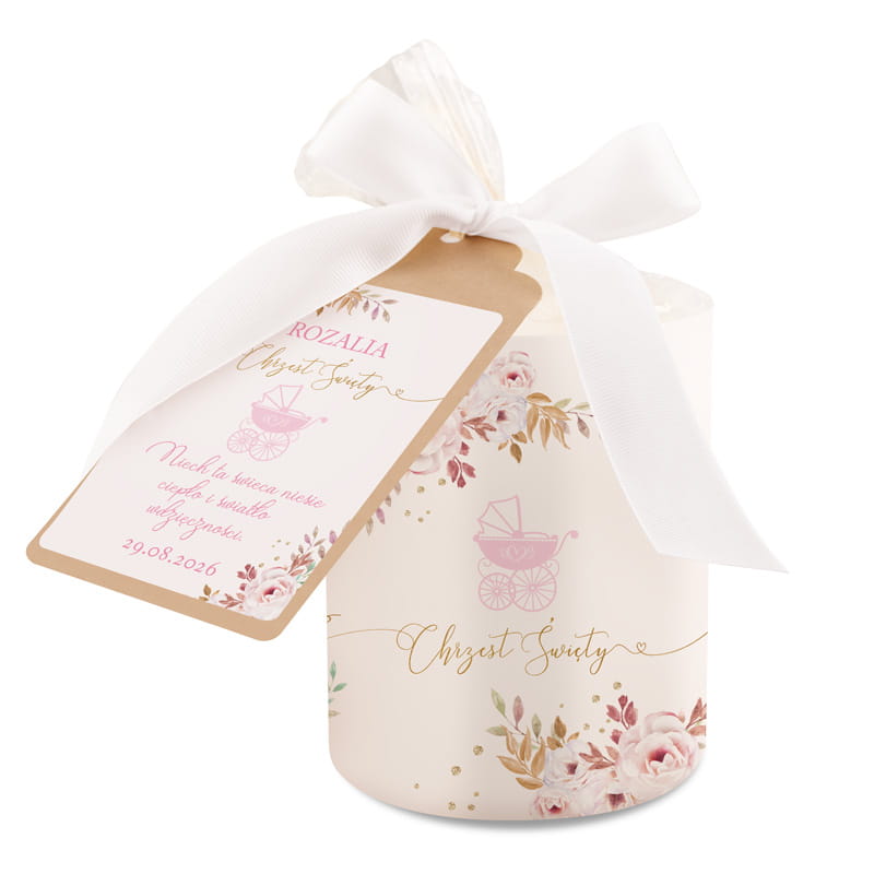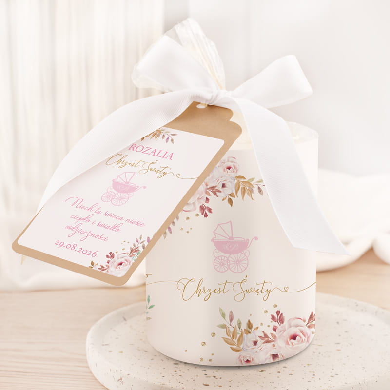 Świeca z bilecikiem podziękowanie na Chrzest z motywem różowego wózka to wyjątkowy i symboliczny upominek, który doskonale sprawdzi się jako gest wdzięczności dla bliskiej osoby.