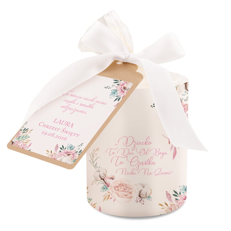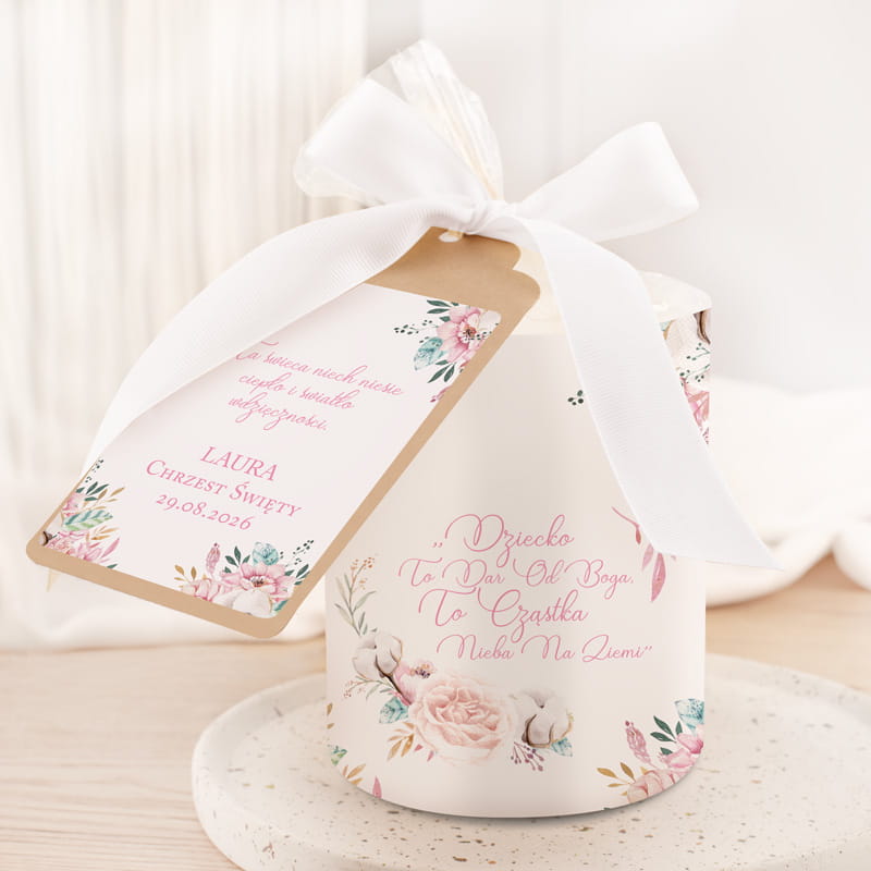 Na świecy znajduje się krótki, elegancki napis, który podkreśla wyjątkowy charakter uroczystości Chrztu Świętego. Do kompletu dołączony jest bilecik z personalizowaną dedykacją, na którym umieszczone są imię dziecka, data Chrztu oraz krótki, wzruszający cytat. Całość tworzy spójny i sentymentalny podarunek, idealny jako podziękowanie dla Matki Chrzestnej, Babci lub innej bliskiej osoby. Motyw kwiatów w jasnych, różowych kolorach nadaje całości dziecięcego i radosnego charakteru. Personalizacja sprawia, że każda świeca staje się unikalną pamiątką tego ważnego dnia.