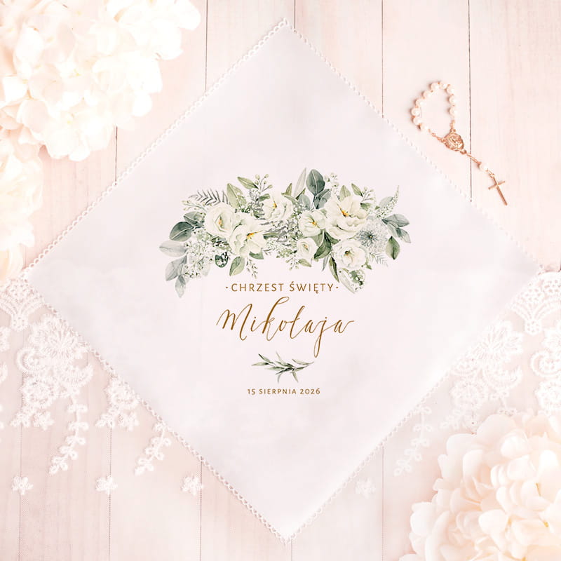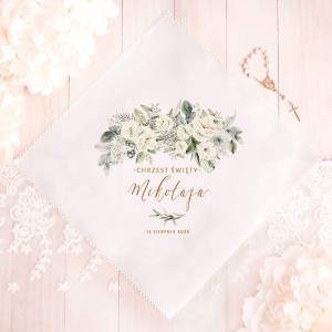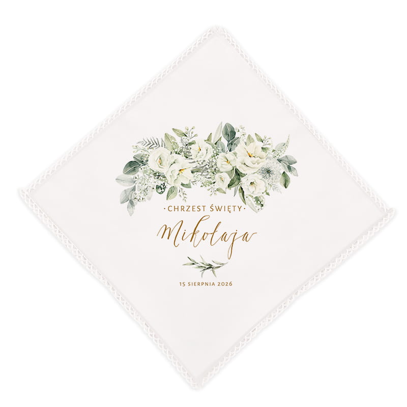 Subtelny florystyczny wzór nadaje całości lekkości i delikatności, idealnie wpisując się w charakter uroczystości. Możliwość personalizacji imieniem dziecka oraz datą Chrztu sprawia, że szatka staje się wyjątkową i niepowtarzalną pamiątką. To indywidualny akcent, który nadaje ceremonii osobisty wymiar i podkreśla znaczenie chwili. Szatka może towarzyszyć dziecku podczas sakramentu, a później pozostać jako cenna pamiątka rodzinna. Kształt rombu dodaje jej nowoczesnego i eleganckiego wyglądu, jednocześnie zachowując tradycyjny charakter. Motyw białych kwiatów symbolizuje czystość, niewinność oraz nowe życie duchowe. Personalizowane imię i data – sprawiają, że każdy egzemplarz jest wyjątkowy i stworzony z myślą o konkretnym dziecku.
