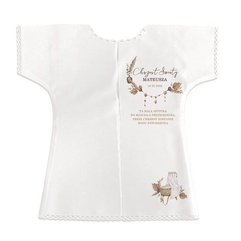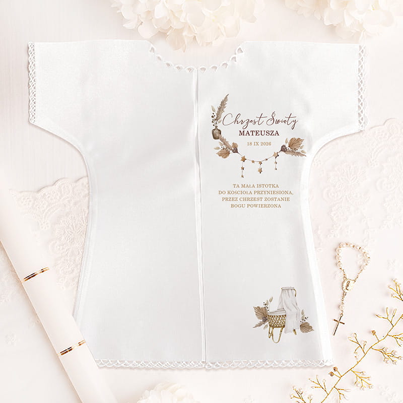 Wyjątkowy wzór inspirowany estetyką boho nadaje całości lekkości i subtelności. Możliwość personalizacji szatki imieniem dziecka oraz datą Chrztu sprawia, że staje się ona niepowtarzalną pamiątką na całe życie. Każdy detal wykonany z myślą o konkretnej uroczystości nadaje jej osobisty i wzruszający charakter. Styl boho idealnie wpisuje się w spokojny, rodzinny klimat ceremonii, dodając jej nowoczesnego i zarazem naturalnego wyrazu. Szatka może być wykorzystana w czasie Chrztu, a następnie przechowywana jako cenna pamiątka. Imię i data na szatce przypominają o wyjątkowości tego dnia i głębokiej więzi duchowej.
