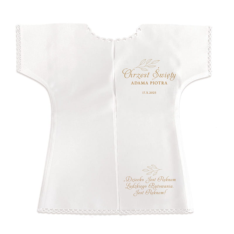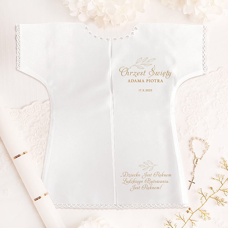 Minimalistyczna forma sprawia, że doskonale wpisuje się w uroczysty nastrój sakramentu. Możliwość personalizacji – poprzez dodanie imienia dziecka oraz daty Chrztu – sprawia, że staje się niepowtarzalną i bardzo osobistą pamiątką. To indywidualny akcent, który nadaje uroczystości szczególnego znaczenia i emocjonalnej głębi. Szatka może towarzyszyć dziecku podczas samej ceremonii, a następnie być przechowywana przez lata jako cenna pamiątka rodzinna. Jej delikatny wygląd dodaje całości lekkości i elegancji, idealnie współgrając z symboliką czystości i nowego początku. Imię i data na szatce nie tylko wyróżniają ją spośród innych dodatków, ale także przypominają o miłości i trosce bliskich.