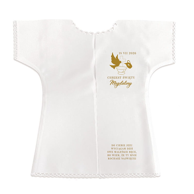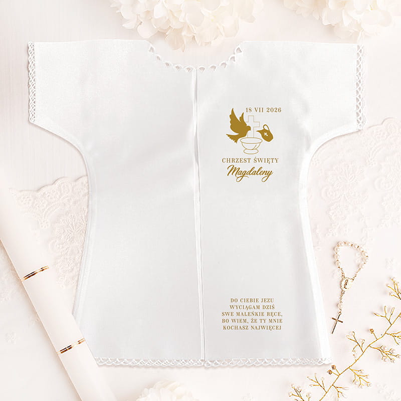 Centralnym motywem jest krzyżmo – znak namaszczenia i wprowadzenia dziecka w życie wiary. Możliwość personalizacji imieniem dziecka oraz datą uroczystości sprawia, że każda szatka staje się jedyna w swoim rodzaju. To pamiątka stworzona z myślą o konkretnym maluszku i jego niepowtarzalnym dniu. Delikatny wzór i subtelny nadruk tworzą elegancką całość, która pięknie prezentuje się podczas ceremonii. Szatka może towarzyszyć dziecku w trakcie sakramentu, a później być przechowywana jako wzruszająca pamiątka na całe życie. Personalizacja czyni ją wyjątkową – nie tylko wizualnie, ale także emocjonalnie. To doskonały prezent od rodziców chrzestnych, dziadków lub bliskich, którzy chcą uczcić tę wyjątkową chwilę w sposób osobisty.