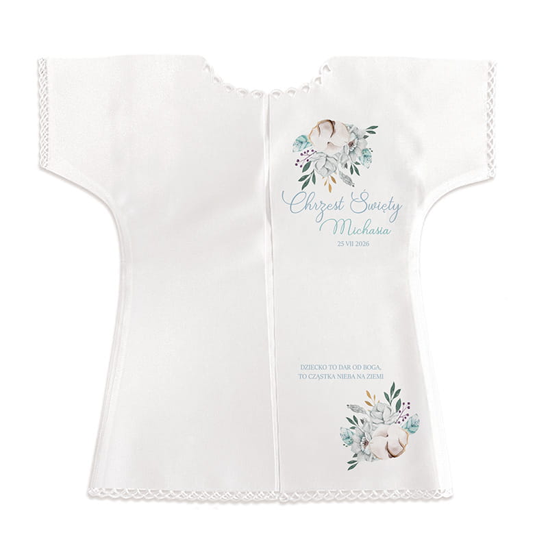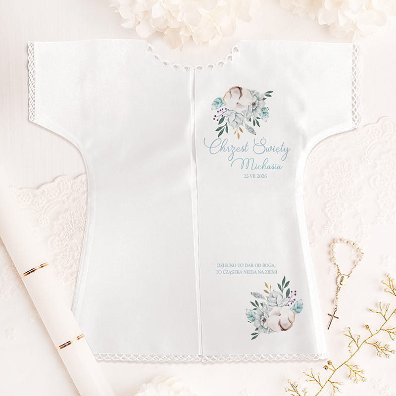 Subtelny, uroczy wzór został stworzony z myślą o najmłodszych, nadając całości delikatny i ciepły charakter. Możliwość personalizacji szatki imieniem dziecka oraz datą Chrztu Świętego sprawia, że staje się ona niepowtarzalną pamiątką na całe życie. To wyjątkowy sposób na uczczenie tego ważnego wydarzenia i zachowanie pięknych wspomnień. Personalizowana szatka to także wyjątkowy gest ze strony rodziców chrzestnych, dziadków czy bliskich, którzy chcą podkreślić wagę uroczystości. Imię i data na szatce nadają jej osobisty wymiar, który wyróżnia ją spośród innych upominków. Delikatny motyw graficzny doskonale wpisuje się w radosną i duchową atmosferę Chrztu. Szatka może być używana podczas ceremonii lub przechowywana jako cenna pamiątka na przyszłość.