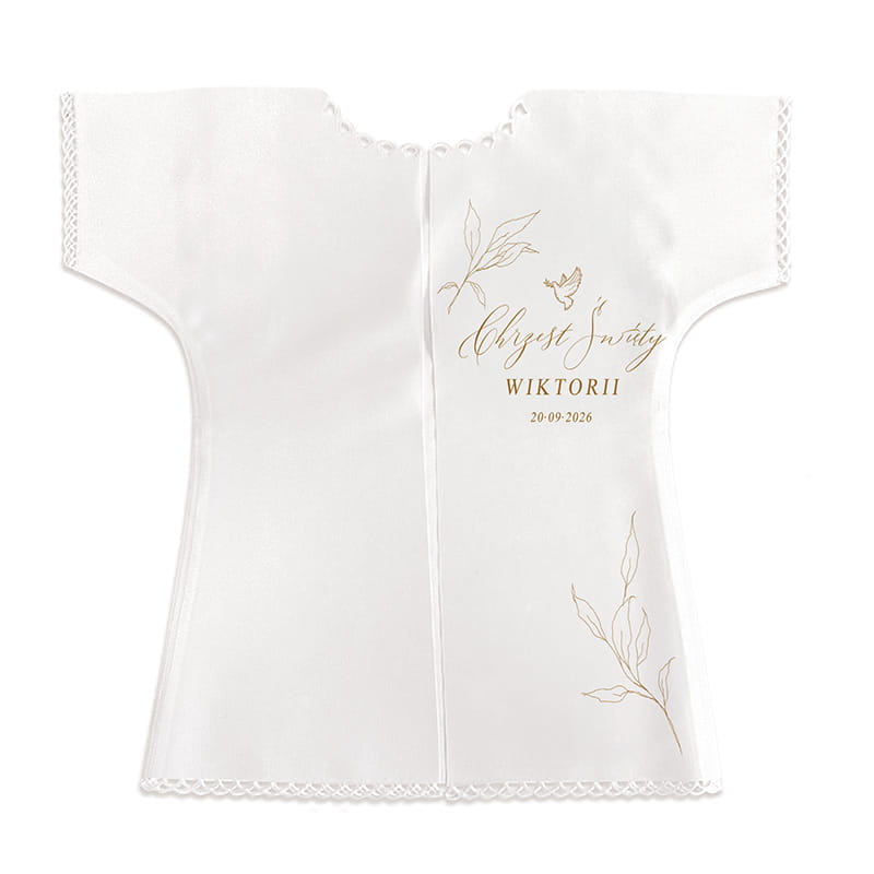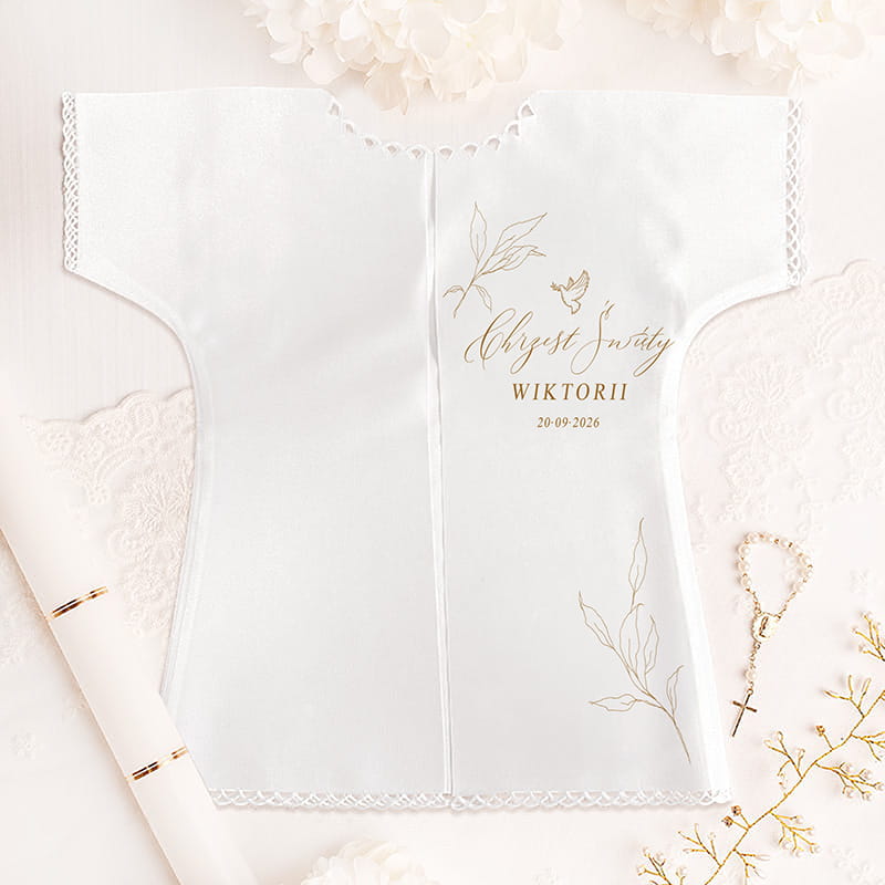 Wyjątkowy wzór w postaci złotych gałązek nadaje całości szlachetnego i duchowego wyrazu. Personalizacja imieniem dziecka oraz datą Chrztu sprawia, że szatka staje się jedyną w swoim rodzaju pamiątką. Taki indywidualny akcent pozwala na stworzenie upominku z myślą o konkretnym maluszku i jego wyjątkowym dniu. Szatka może towarzyszyć dziecku w czasie sakramentu, a następnie zostać zachowana jako cenna pamiątka rodzinnych wspomnień. Złote elementy graficzne symbolizują wartość, duchowe bogactwo i czystość, doskonale współgrając z przesłaniem Chrztu Świętego. Kształt oraz delikatny design sprawiają, że szatka pięknie prezentuje się na zdjęciach i podczas ceremonii. To nie tylko praktyczny dodatek, ale także wyraz głębokiego uczucia i troski bliskich.