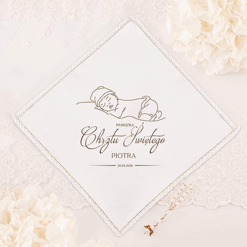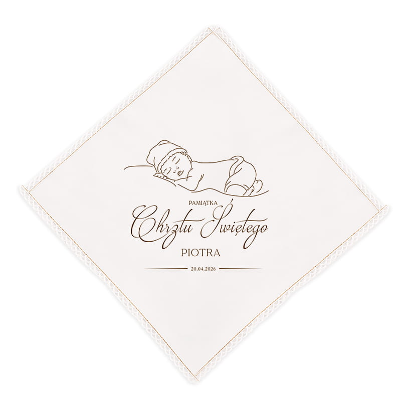 Delikatny, dziecięcy wzór wprowadza naturalny, spokojny akcent, idealnie wpisujący się w charakter uroczystości. Najważniejszym wyróżnikiem szatki jest możliwość personalizacji – umieszczenie imienia dziecka oraz daty Chrztu Świętego. Dzięki temu staje się nie tylko praktycznym dodatkiem do sakramentu, ale także trwałą pamiątką tego wyjątkowego dnia. Kształt rombu nadaje jej oryginalności i elegancji, odróżniając ją od klasycznych wzorów.Śpiące dziecko symbolizuje spokój, życie i duchowe odrodzenie, co doskonale wpisuje się w znaczenie Chrztu. Personalizacja sprawia, że szatka jest niepowtarzalna i stworzona specjalnie z myślą o konkretnym dziecku.