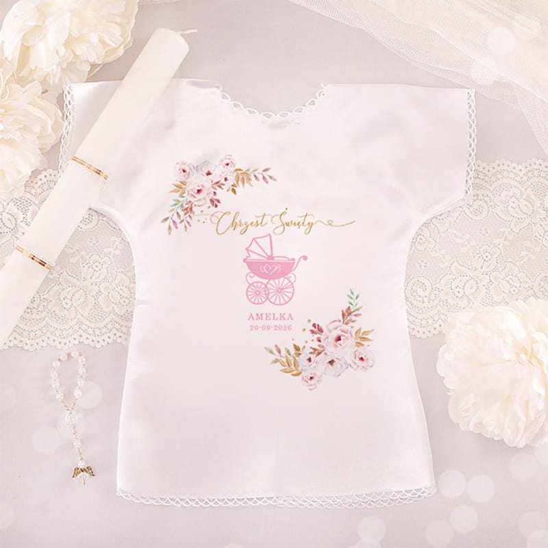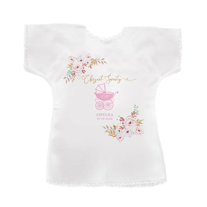 Możliwość personalizacji imieniem dziecka oraz datą Chrztu sprawia, że staje się pamiątką jedyną w swoim rodzaju. To piękny sposób na utrwalenie chwili, która ma ogromne znaczenie duchowe i emocjonalne dla całej rodziny. Motyw różowego wózka dodaje dziecięcej lekkości i radości, podkreślając wyjątkowość małej dziewczynki. Szatka może zostać wykorzystana podczas ceremonii, a później przechowywana jako cenna pamiątka na lata. Każdy detal od personalizowanych napisów po symboliczny wzór ma swoje znaczenie i wzbudza emocje. Imię i data Chrztu nadrukowane na szatce pozwalają z łatwością przywołać wspomnienia po latach.