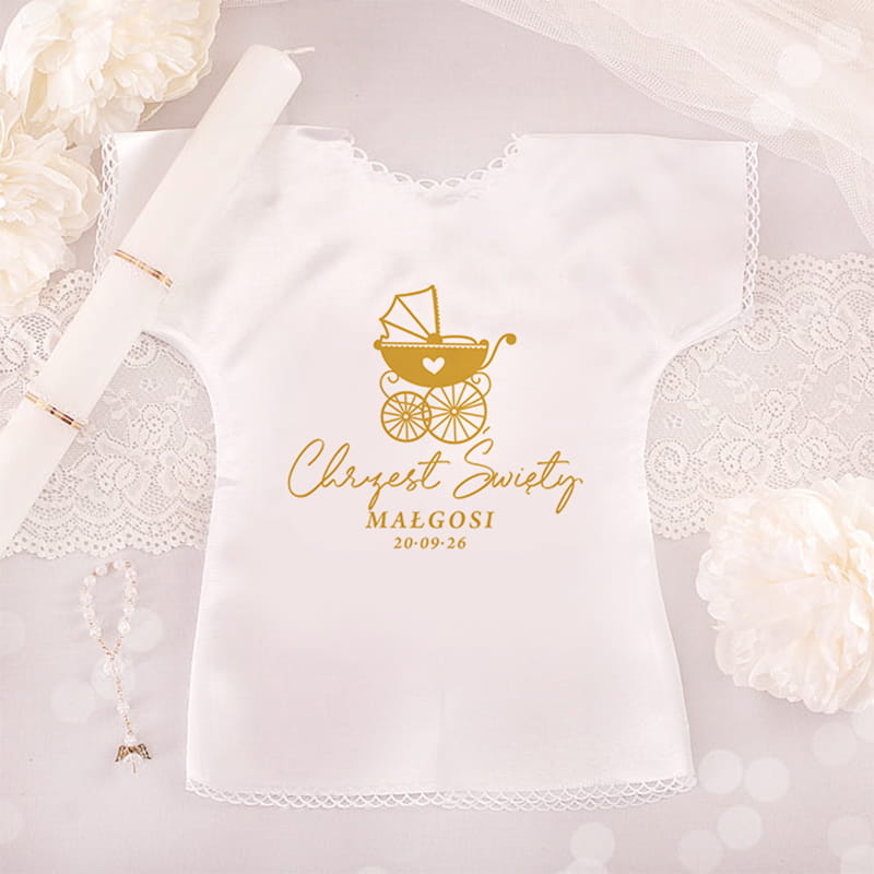 Możliwość umieszczenia imienia dziecka oraz daty Chrztu Świętego sprawia, że staje się wyjątkowym i osobistym dodatkiem do ceremonii. Personalizacja pozwala nadać szatce indywidualny charakter, który będzie przypominał o tym ważnym dniu przez długie lata. Motyw złotego wózka nawiązuje do początku nowej drogi życia i błogosławieństwa, jakie niesie sakrament Chrztu.