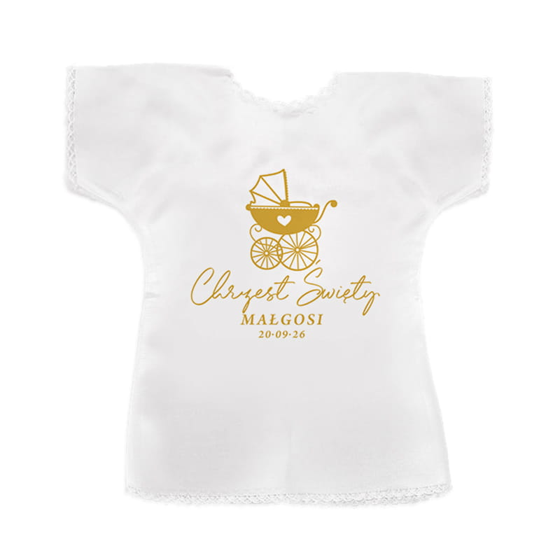 Złoty detal dodaje subtelnego blasku i podkreśla wyjątkowość wydarzenia. Szatka może być przekazana przez rodziców chrzestnych, dziadków lub bliskich jako wyraz miłości i troski. Dzięki umieszczonym na niej danym, staje się niepowtarzalną pamiątką dedykowaną konkretnemu dziecku. Szatka na Chrzest złoty wózek to nie tylko dodatek do stroju na uroczystość, ale także trwały symbol duchowego początku.To prezent pełen emocji, który wywołuje wzruszenie nawet po wielu latach. Personalizacja czyni z niej unikalną pamiątkę, która zawsze będzie przypominać o miłości i duchowym wsparciu najbliższych.