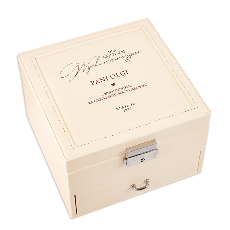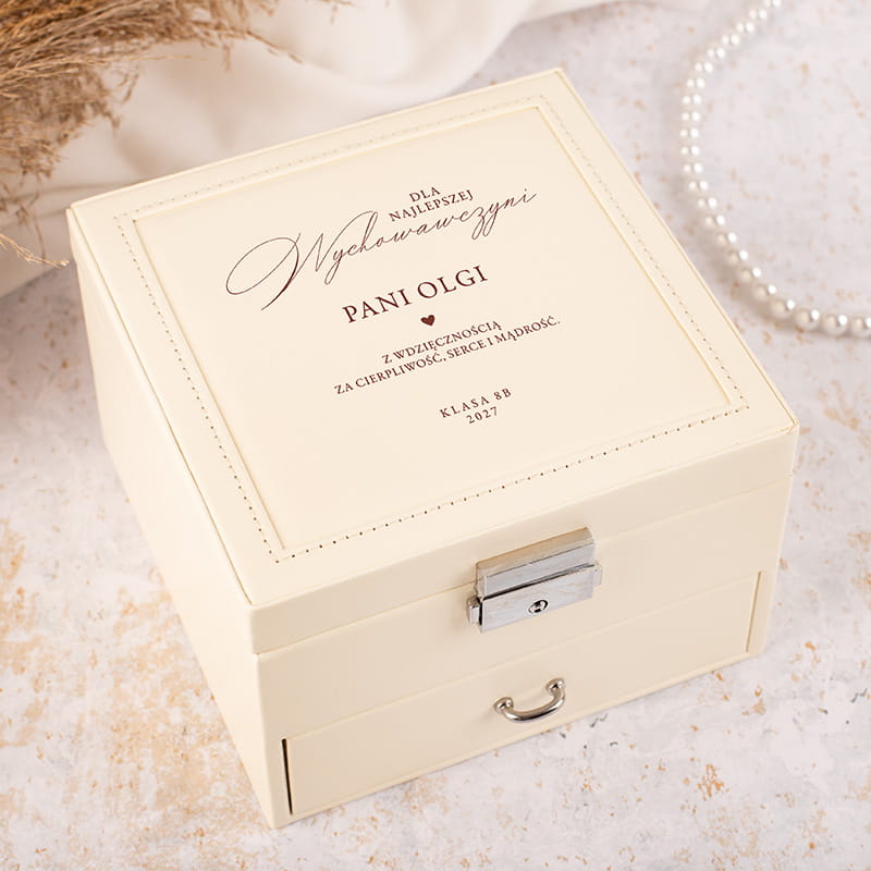 Jeśli szukasz wyjątkowego prezentu dla nauczycielki, która przez lata otaczała Twoje dziecko opieką, cierpliwością i mądrością, ta elegancka szkatułka na biżuterię będzie idealnym wyborem. W pastelowym odcieniu kremowym, łączy w sobie praktyczność i ponadczasową estetykę. Na wieczku umieszczony został subtelny napis dedykacyjny, który można spersonalizować – to doskonały sposób, by wyrazić wdzięczność wychowawczyni za jej zaangażowanie i wsparcie. Dzięki zamykanej klapce z metalowym zamkiem oraz wygodnej szufladzie na drobiazgi, szkatułka świetnie sprawdzi się do przechowywania pierścionków, kolczyków, naszyjników czy innych cennych pamiątek.
