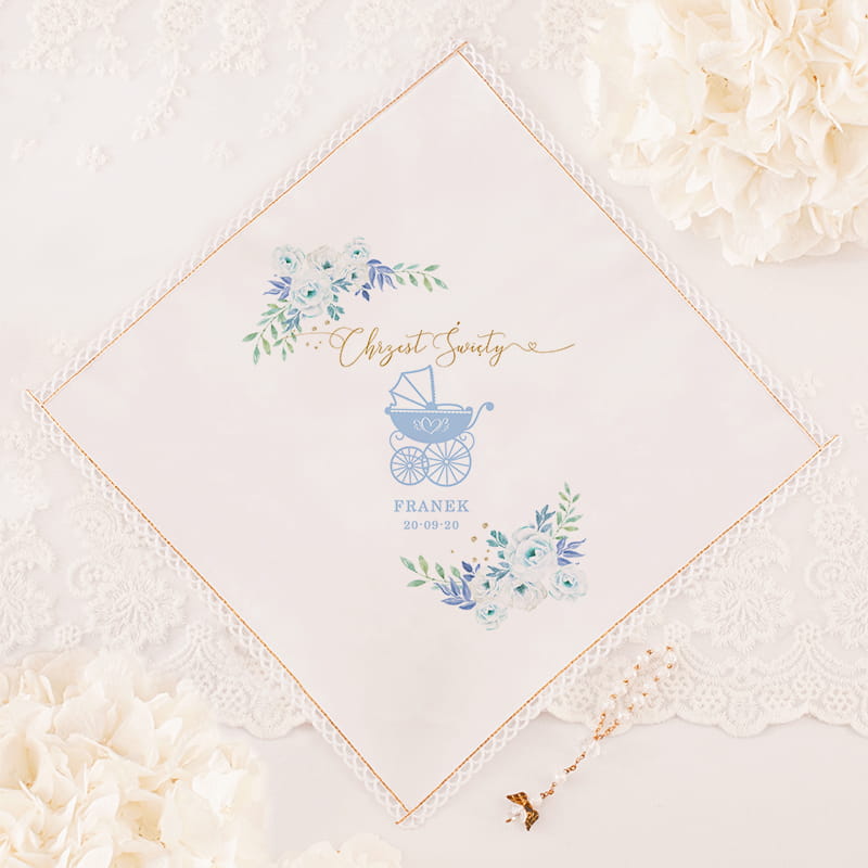Szatka na Chrzest niebieski wózek to wyjątkowy element uroczystości, który można spersonalizować imieniem dziecka oraz datą Chrztu Świętego. Dzięki takiej personalizacji staje się niepowtarzalną pamiątką tego szczególnego dnia. Delikatny motyw niebieskiego wózka podkreśla dziecięcy charakter i radosny nastrój wydarzenia.