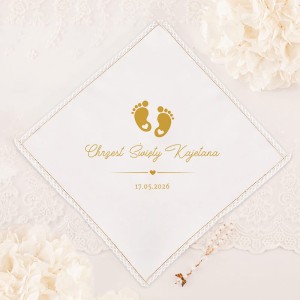 Personalizowana szatka do Chrztu Świętego z motywem małych dziecięcych stópek to elegancka pamiątka, która idealnie dopełnia uroczystość chrztu.