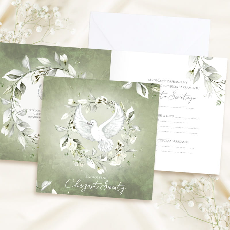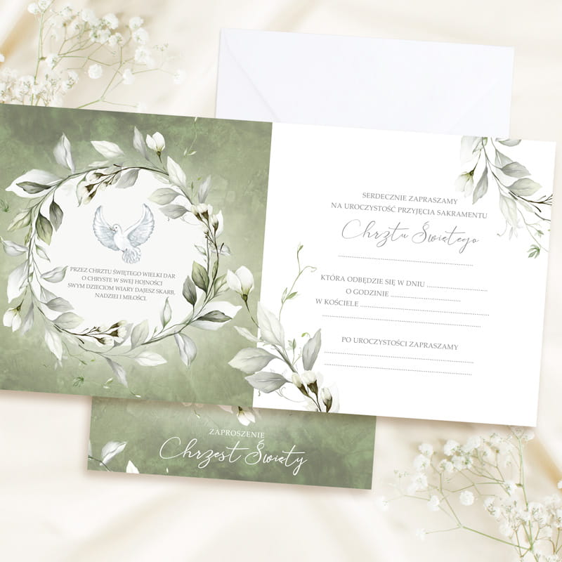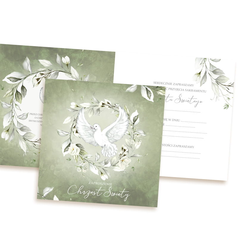 Ich spokojna tonacja wprowadza w atmosferę harmonii i refleksji. Zieleń kojarzy się z odnową, życiem i naturalnością, co idealnie pasuje do charakteru chrztu. Zaproszenia kwadratowe na Chrzest Święty w zielonej kolorystyce gotowe są do wypełnienia. Na okładce zaproszenia znajduje się duży gołąb. Symbolizuje on pokój, czystość i obecność Ducha Świętego. Gołąb rozpościera skrzydła, jakby zapraszał do wspólnego przeżywania ważnej chwili. Jego obecność na środku okładki podkreśla znaczenie sakramentu. Dookoła ptaka rozciąga się wianek z kwiatów. Wianek stanowi zamkniętą, pełną formę, która symbolizuje wieczność i ciągłość. Kwiaty rozmieszczone są równomiernie, tworząc harmonijną oprawę. Ich kształty są miękkie, a kolory stonowane, co nadaje kompozycji delikatności. Zieleń liści przeplata się z jasnymi barwami płatków. Całość sprawia wrażenie naturalnej lekkości i spokoju.