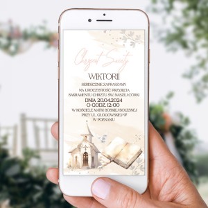 Elektroniczne zaproszenie na Chrzest Święty zachęca do wspólnego przeżywania tego ważnego momentu w gronie najbliższych. Kościół i Biblia jako motywy przewodnie wyraźnie wskazują na głębię duchową uroczystości. Beżowe odcienie łagodzą całość, nadając jej spokojny i wyważony charakter. Zaproszenie tworzy piękne tło dla wspólnego świętowania i dzielenia się radością. Motywy natury i religii łączą się w nim w spójną, wzruszającą opowieść. To wyjątkowy wstęp do dnia pełnego wiary, miłości i rodzinnych wzruszeń.