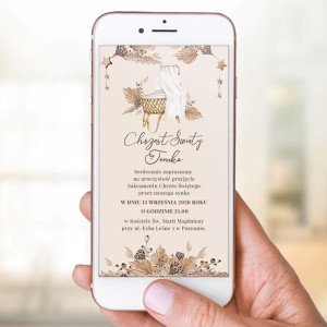 Zaproszenie elektroniczne na Chrzest Święty w stylu boho zachwyca subtelną elegancją i naturalnymi motywami. Ciepłe barwy, delikatne kwiaty oraz rustykalne akcenty tworzą wyjątkowy klimat tego uroczystego dnia. Wzór idealnie oddaje atmosferę bliskości, harmonii i rodzinnej radości. To piękna forma, by w wyjątkowy sposób zaprosić bliskich na tę niezapomnianą uroczystość.