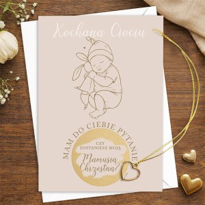 Zdrapka pytanie do Mamy Chrzestnej skrywa pod specjalną warstwą wzruszające pytanie skierowane od przyszłego chrześniaka. Na ilustracji znajdującej się na okładce widnieje śpiące dziecko. Motyw śpiącego dziecka z misiem podkreśla bliskość, czułość i bezpieczeństwo. Zdrapka pytanie do Mamy Chrzestnej pozwala w oryginalny sposób zaprosić ukochaną osobę do roli mamy chrzestnej. Odkrycie ukrytego pytania sprawia, że moment ten staje się szczególnie wzruszający. Zdrapka idealnie sprawdzi się podczas kameralnego spotkania rodzinnego lub większej uroczystości. Jest niewielka, dzięki czemu łatwo można ją wręczyć samodzielnie lub dołączyć do prezentu.
