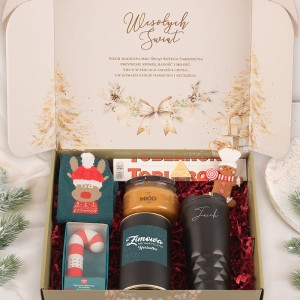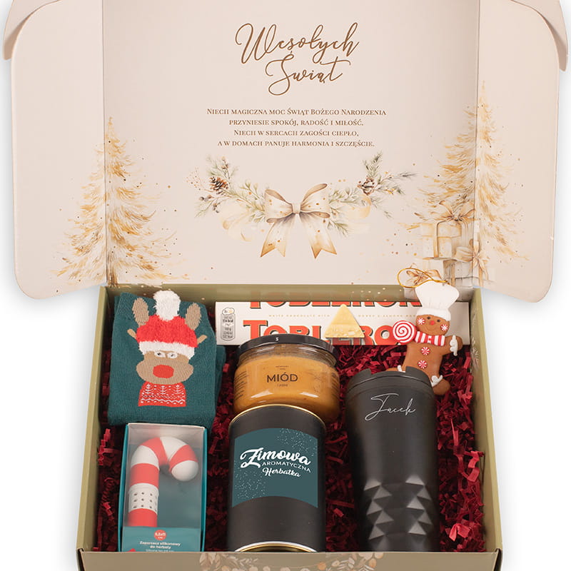 Wewnątrz prezentowego pudełka znajduje się matowy, czarny kubek termiczny z personalizowanym grawerem imienia. Aromatyczna zimowa herbata zamknięta w metalowej puszce świetnie komponuje się z dołączonym naturalnym miodem w słoiku. Radosnego charakteru nadają również świąteczne skarpety. W komplecie znajduje się także silikonowy zaparzacz w kształcie laski cukrowej, tabliczka klasycznej czekolady Toblerone oraz zawieszka z piernika w świątecznym stylu. Całość umieszczona jest w ozdobnym pudełku z elegancką grafiką i życzeniami na wieczku.