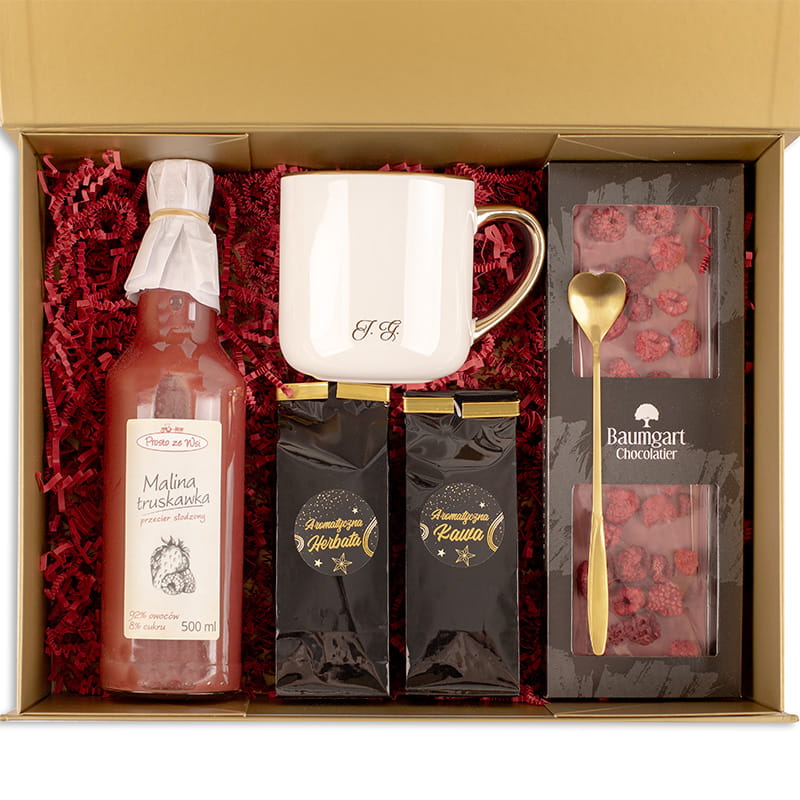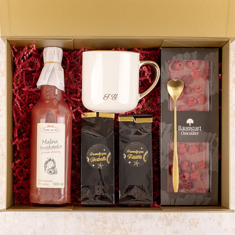 Elegancki prezent dla nauczyciela na koniec roku szkolnego, zestaw zawiera kubek z inicjałami, złotą łyżeczkę w kształcie serca, aromatyczną herbatę i kawę, tabliczkę czekolady oraz mus owocowy. Wszystko zapakowane w estetyczne pudełko, gotowe do wręczenia.