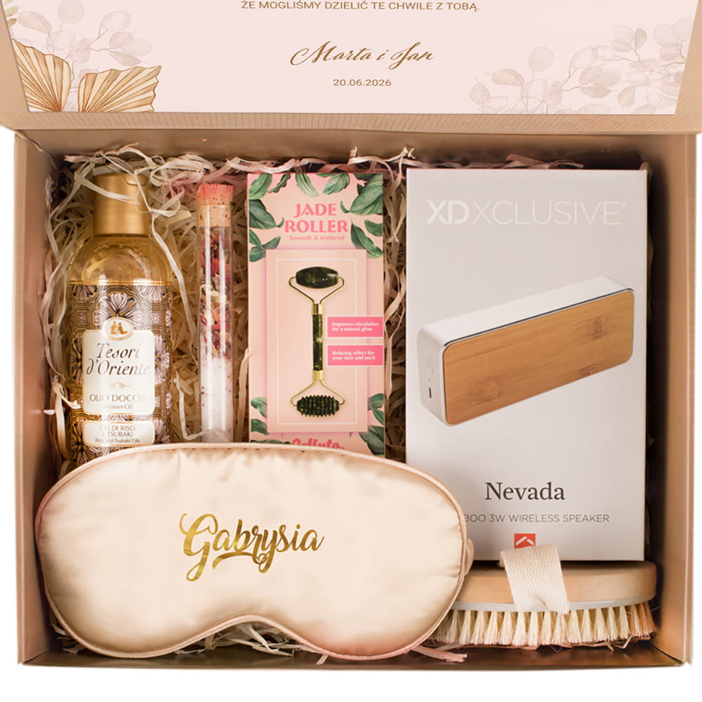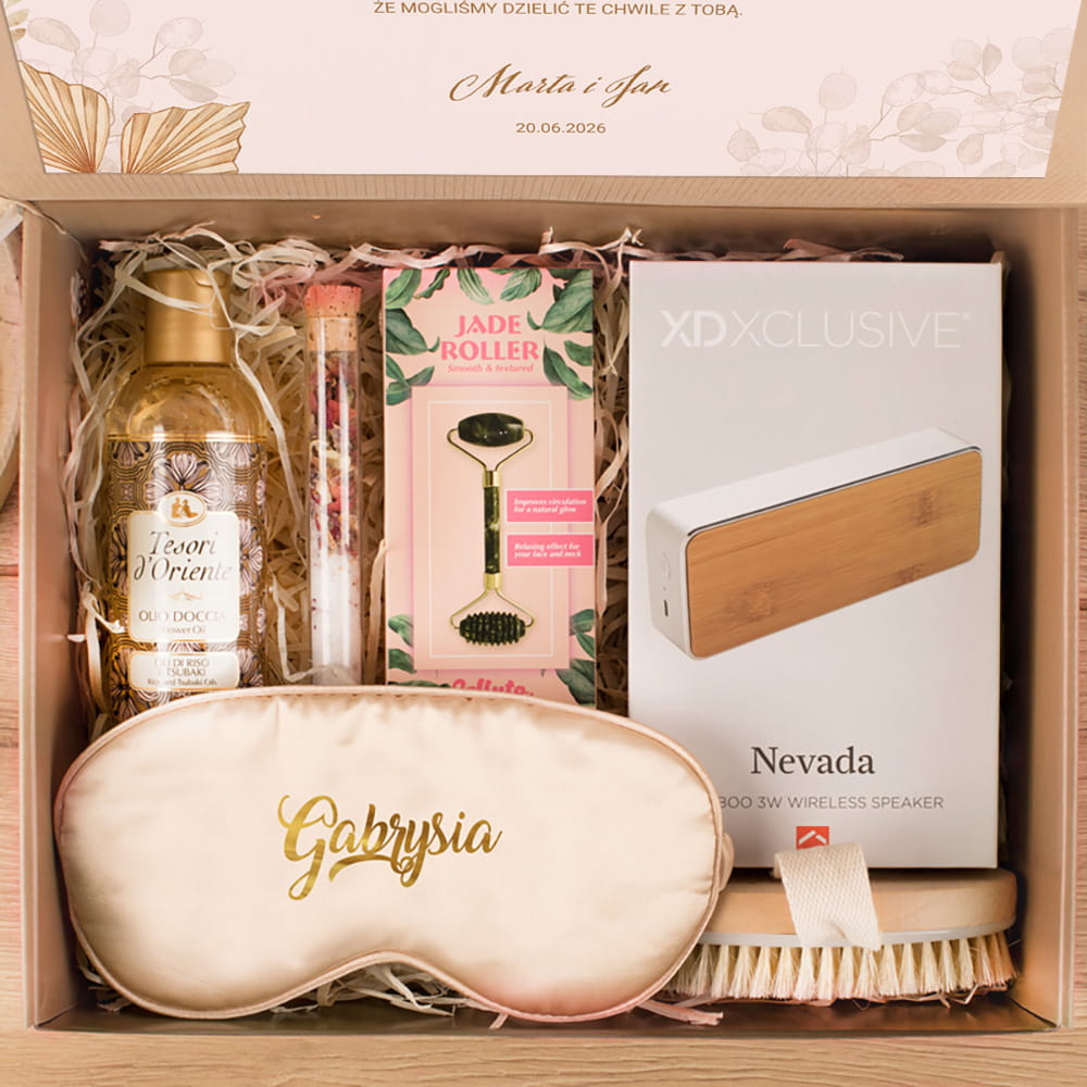 To nie tylko elegancki gest, ale przede wszystkim wyraz wdzięczności za wsparcie, obecność i zaangażowanie w przygotowania do jednego z najważniejszych dni w życiu. Taki zestaw może być wręczony w podziękowaniu za przyjęcie roli świadkowej, stanowiąc piękne przypomnienie wspólnie przeżytych chwil. Idealnie sprawdzi się również jako prezent na wieczór panieński, dodając odrobinę luksusu do tego radosnego wydarzenia. Zawartość boxa została starannie dobrana, by dostarczyć chwil relaksu i odprężenia. W środku znajduje się opaska na oczy, która świetnie sprawdzi się podczas snu lub wieczornego odpoczynku. Roler do twarzy to doskonały dodatek do codziennej pielęgnacji i odprężających rytuałów beauty. Szczotka do masażu ciała na sucho pomaga w codziennej rutynie pielęgnacyjnej, przynosząc przy tym relaks i moment dla siebie. Sól do kąpieli tworzy domowe spa i zachęca do zatrzymania się na chwilę w biegu codzienności. Aromatyczny żel do kąpieli uzupełnia rytuał i dodaje całości wyjątkowego charakteru. Całość dopełnia stylowy głośnik, który pozwala stworzyć atmosferę relaksu przy ulubionej muzyce. Zestaw prezentowy podziękowanie dla świadkowej łączy w sobie praktyczność i emocje, dając świadkowej to, co najlepsze – troskę i uznanie. Każdy element zestawu ma swoje znaczenie i razem tworzą spójną kompozycję idealną do celebracji kobiecości i przyjaźni.