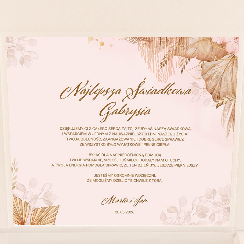 Zestaw prezentowy to ekskluzywne podziękowanie dla świadkowej, które idealnie sprawdzi się jako upominek wręczany w dniu ślubu. To wyjątkowy sposób na wyrażenie wdzięczności za obecność, wsparcie i emocje towarzyszące przygotowaniom do tego ważnego dnia. Taki zestaw będzie również doskonałym prezentem w ramach podziękowania za przyjęcie roli świadkowej. Świetnie pasuje także jako elegancki upominek na wieczór panieński, podkreślający bliską relację i wspólne przeżycia.