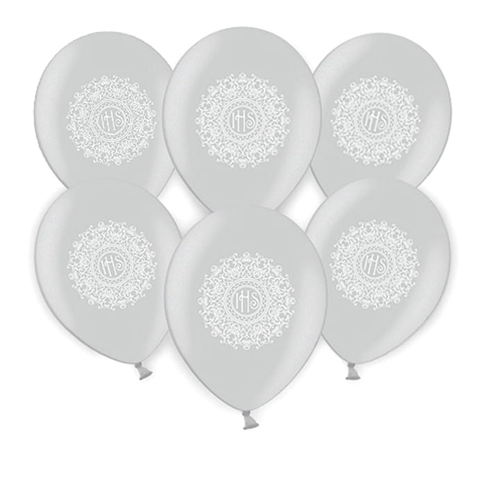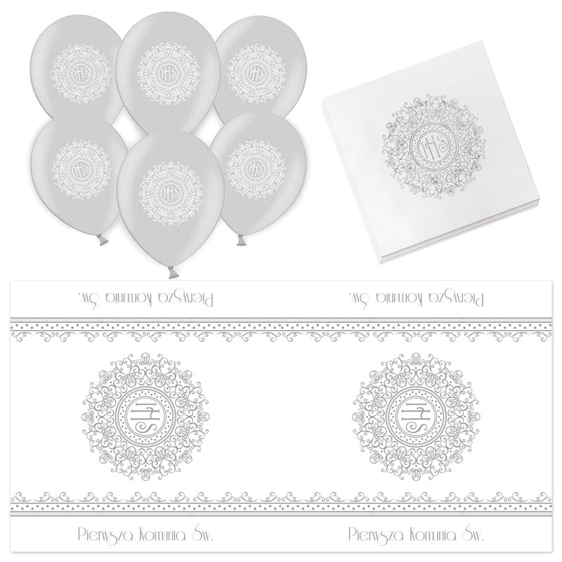 Zestaw dekoracji na Pierwszą Komunię Świętą zawiera bieżnik, serwetki oraz balony, tworząc spójną i elegancką oprawę uroczystości. Wszystkie elementy zestawu utrzymane są w srebrnej kolorystyce, co podkreśla uroczysty charakter wydarzenia. Na dekoracjach widoczny jest symbol IHS, który nawiązuje do religijnego wymiaru ceremonii. To gotowy komplet, który pozwala efektownie udekorować stół i przestrzeń podczas przyjęcia.