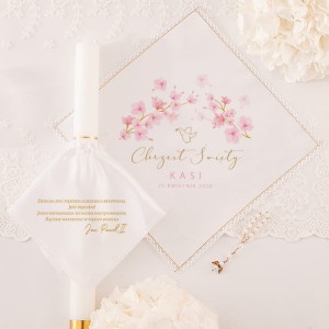 Szatka może zostać ozdobiona imieniem dziecka oraz datą uroczystości, co czyni ją jedyną w swoim rodzaju pamiątką tego niezwykle ważnego dnia. Centralnym elementem dekoracji są piękne, różowe magnolie — kwiaty symbolizujące niewinność, czystość i duchowe odrodzenie. Całość dopełnia elegancki napis „Chrzest Święty”, który podkreśla sakralny charakter wydarzenia. Stroik na świecę, utrzymany w tym samym stylu, idealnie komponuje się z szatką, tworząc spójną i estetyczną całość.Na stroiku na świecę znajduje się również inspirujący cytat Jana Pawła II, który dodaje mu duchowego znaczenia. Kwiatowa grafika oraz subtelne kolory dodają zestawowi uroku i sprawiają, że prezentuje się on niezwykle uroczyście. Ozdobne wykończenia na brzegach szatki wprowadzają lekkość i elegancję, wyróżniając ją spośród klasycznych dodatków liturgicznych. Personalizacja nadaje zestawowi wyjątkowego charakteru i emocjonalnej wartości — staje się on symbolem miłości, troski i duchowego wsparcia bliskich.