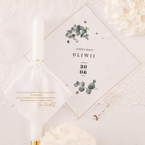 Zestaw do Chrztu Świętego zawiera szatkę w kształcie rombu oraz stroik na świecę z motywem świeżego eukaliptusa. Całość można spersonalizować, umieszczając imię dziecka oraz datę uroczystości, co nadaje zestawowi wyjątkowy i osobisty charakter. Delikatny, roślinny motyw podkreśla duchowy wymiar wydarzenia i wprowadza naturalną elegancję. To piękna pamiątka, która na długo pozostanie w sercu rodziny.