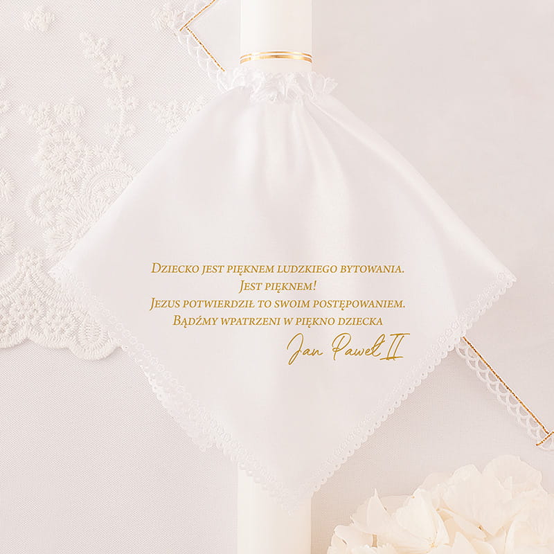 W jego skład wchodzi szatka w kształcie rombu oraz dopasowany stroik na świecę, oba utrzymane w motywie subtelnych liści eukaliptusa. Najważniejszym elementem zestawu jest możliwość personalizacji, na szatce umieszczane są imię dziecka oraz data uroczystości. Taki detal sprawia, że całość staje się osobistą i niepowtarzalną pamiątką z dnia Chrztu. Motyw eukaliptusa symbolizuje odnowę, życie i spokój, doskonale pasując do duchowego charakteru ceremonii. Stroik na świecę uzupełnia całość, tworząc harmonijny i dopracowany zestaw. Dzięki spersonalizowanym elementom zestaw staje się szczególnym symbolem więzi rodzinnych i wspólnego przeżywania sakramentu.