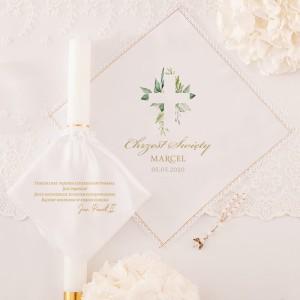 Zestaw do Chrztu Świętego zielone listki składa się z szatki w kształcie rombu oraz stroika na świecę. Całość ozdobiona jest delikatnym, roślinnym motywem, który podkreśla uroczysty charakter ceremonii. Istnieje możliwość personalizacji – na szatce można umieścić imię dziecka oraz datę uroczystości. To wyjątkowa pamiątka, która na długo pozostanie w rodzinnych wspomnieniach.